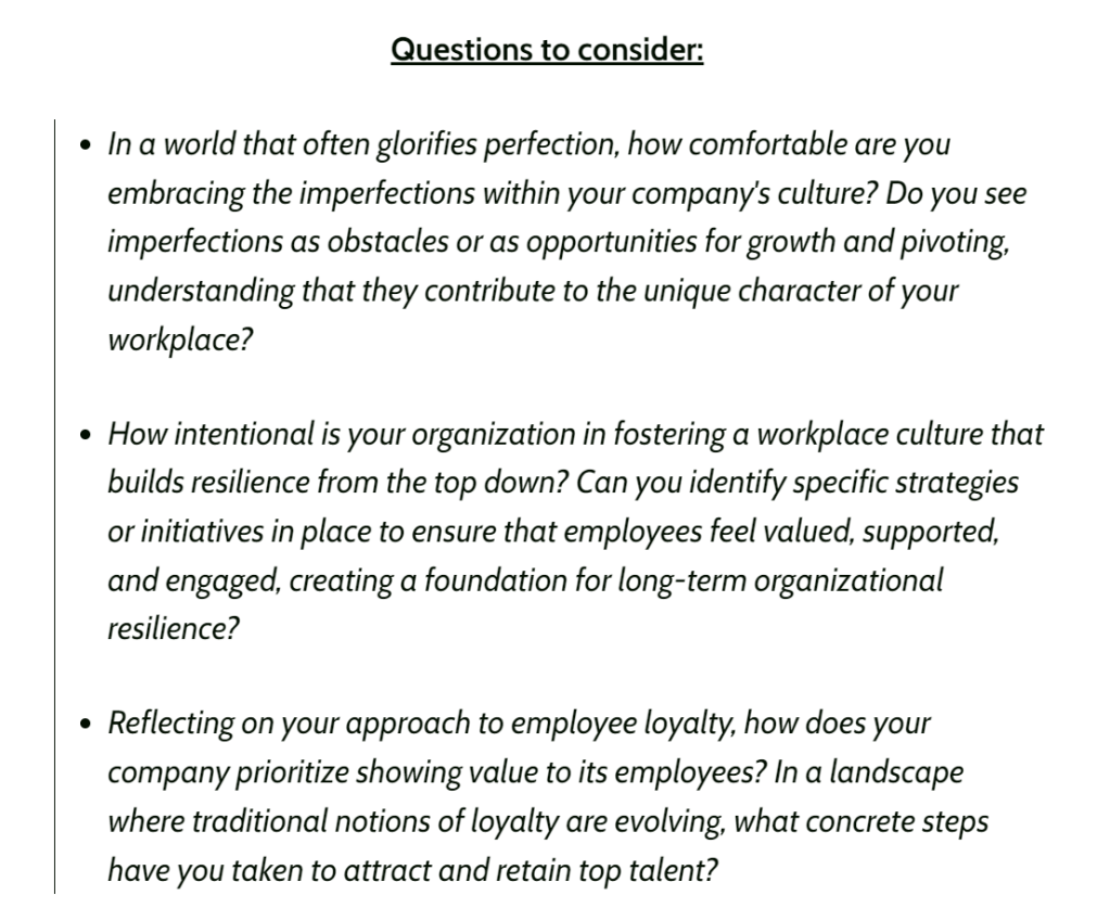 Building a Culture of Resilience: A workplace culture designed with intention becomes the backbone of a resilient organization. When employees feel valued, supported, and engaged, they are more likely to contribute their best work. This isn’t something that you can buy from a vendor, it has to be intentional from the top down. This resilience enables a company to navigate challenges, adapt to change, and even thrive in the face of adversity.