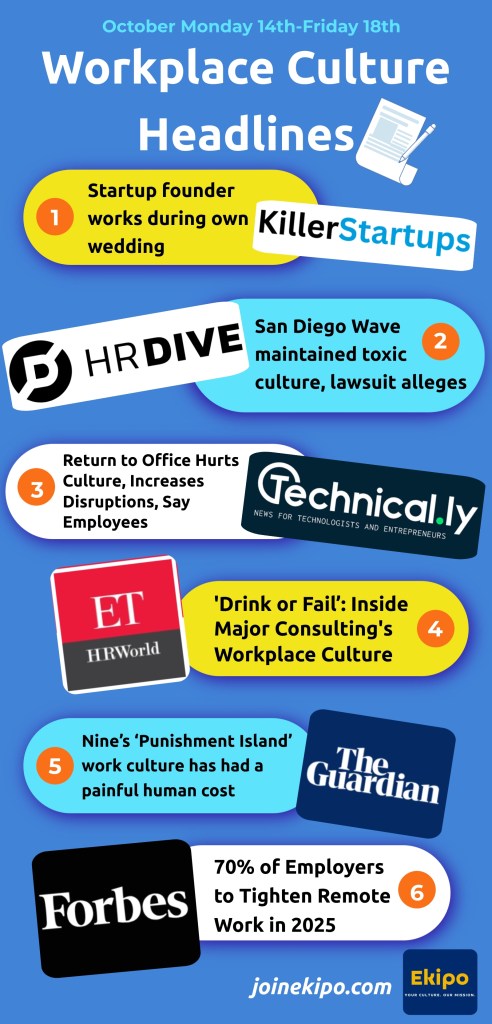 This week’s workplace culture headlines highlight the growing tension between traditional business practices and the evolving needs of modern employees. From a startup founder working during his own wedding to reports of toxic environments and “drink or fail” cultures at major consulting firms, it’s clear that work-life balance and employee well-being are under immense pressure. At the same time, companies are grappling with the future of remote work, with 70% of employers planning to crack down by 2025, raising concerns about its impact on productivity and culture.