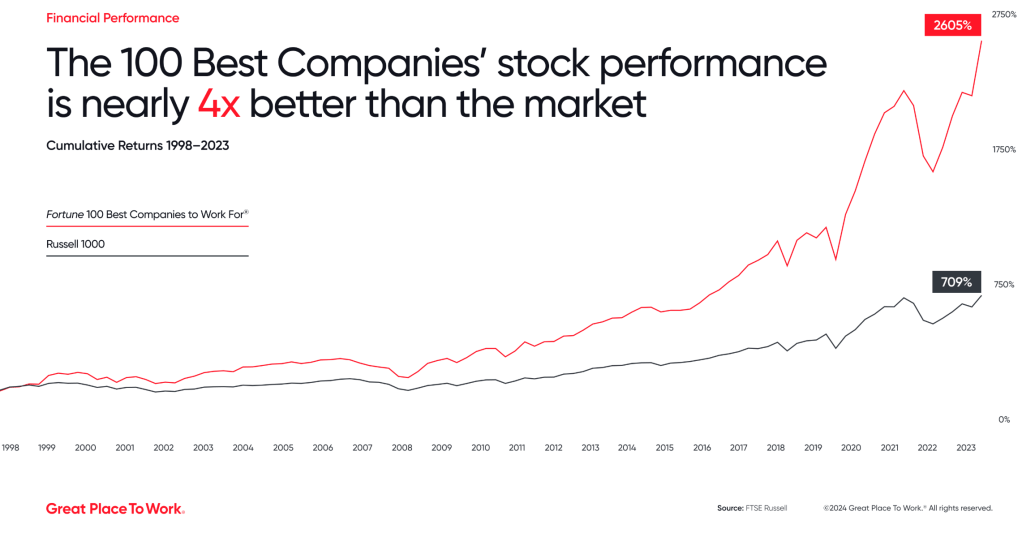 The data bears this out – companies that consistently rank on the Fortune 100 Best Companies to Work For list see nearly 4 times the stock returns of the broader market over the past 25 years.
