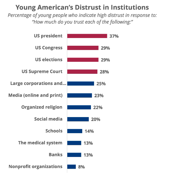 A growing trend that many want to avoid talking about is the declining trust in social institutions, corporations and governments. Just look at the most recent survey amoung young Americans from last year. With these levels of distrust, startups have a huge opportunity to capitalize on it.