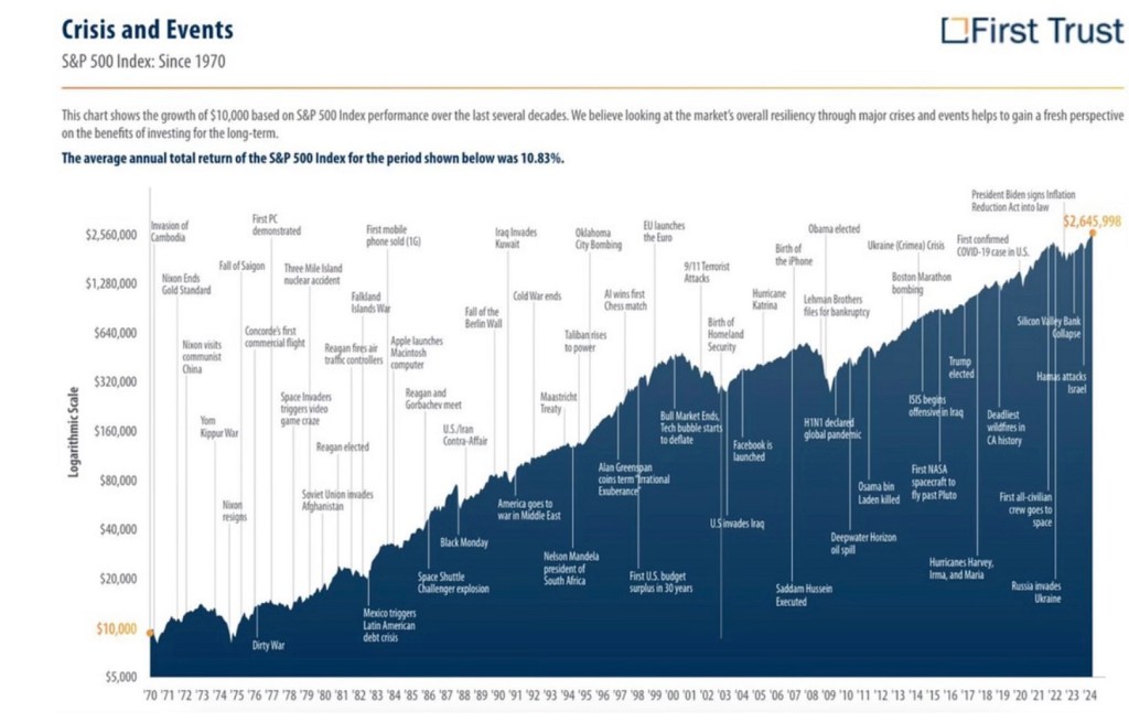 The S&P 500 chart tells a compelling story: despite wars, recessions, terrorist attacks, and global pandemics, the market has delivered a remarkable 10.83% annual return since 1970. But this long-term success masks periods of intense volatility and uncertainty—moments that mirror what founders experience on a smaller scale.