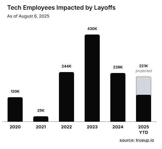 Since 2022, the tech industry has endured a historic wave of job cuts, with 2023 alone impacting over 430,000 employees. And 2025 is on track to surpass 220,000—despite early optimism about market recovery.