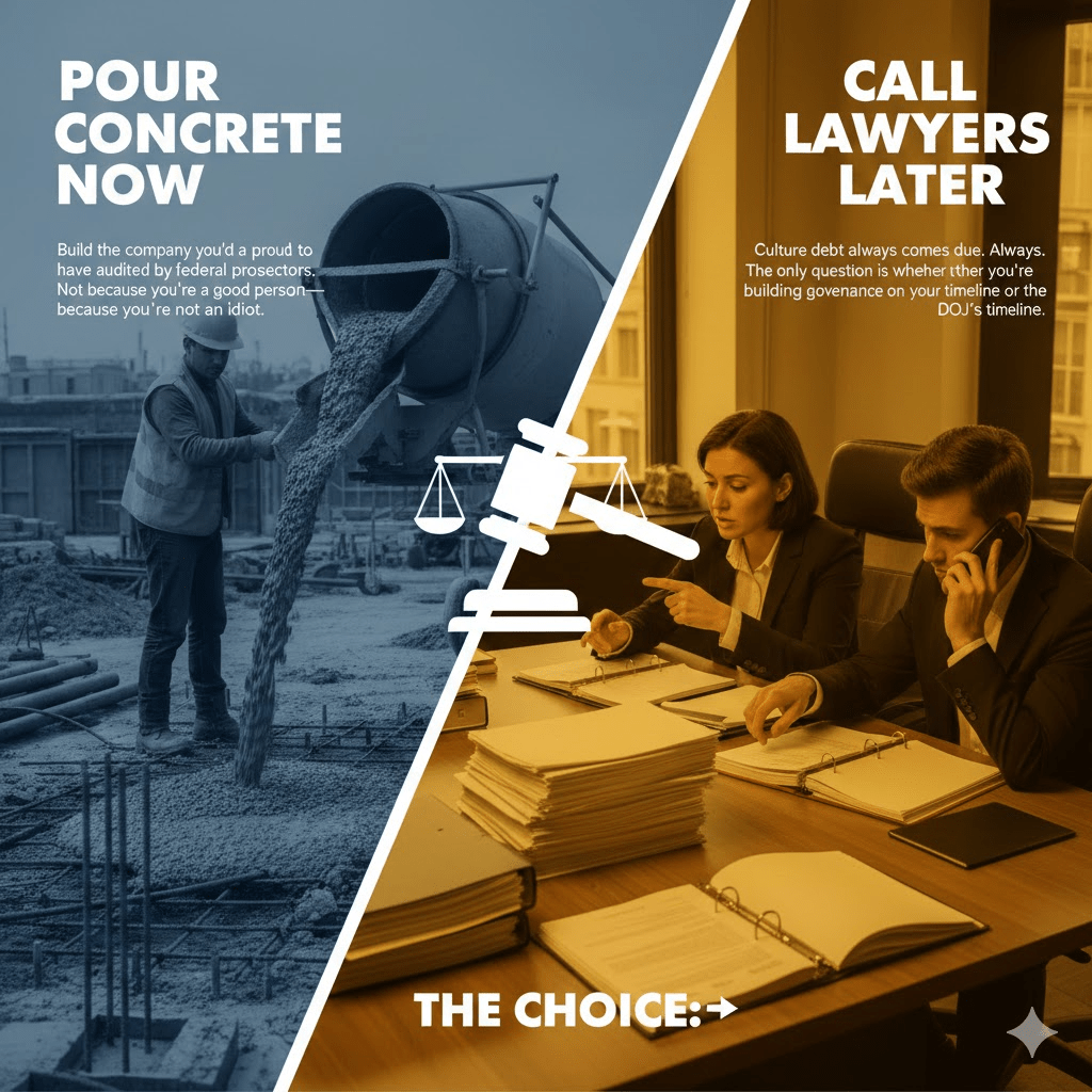 Keep in mind that culture debt always comes due. Always. The only question is whether you’re building governance on your timeline or the DOJ’s timeline.
